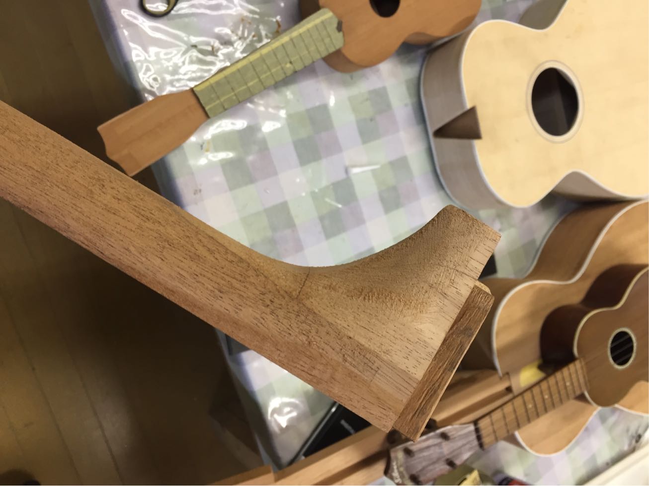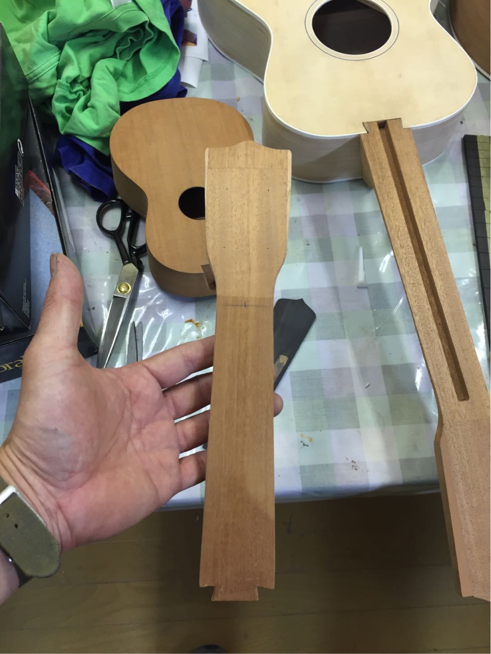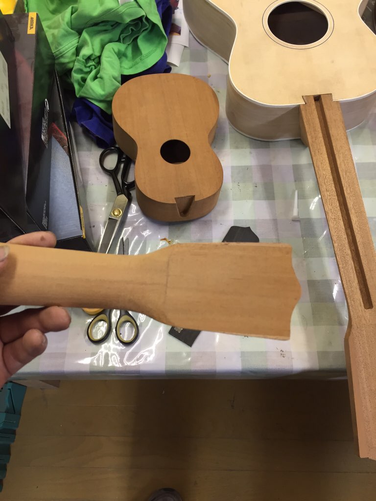 そもそもギターの制作はまだ初心者故に人のギターは作らないと宣言している。でも制作をしていると私にも一本作ってなんて話は結構ある。しかし今回はいろいろいきさつもありギターは作らないと宣言しているがウクレレなら良いだろう、、、なわけないがまあ作ることになったわけで、本人も制作にとても興味もあることだし出来るところは手伝ってもらおう、しかネックは好みもあるしね。