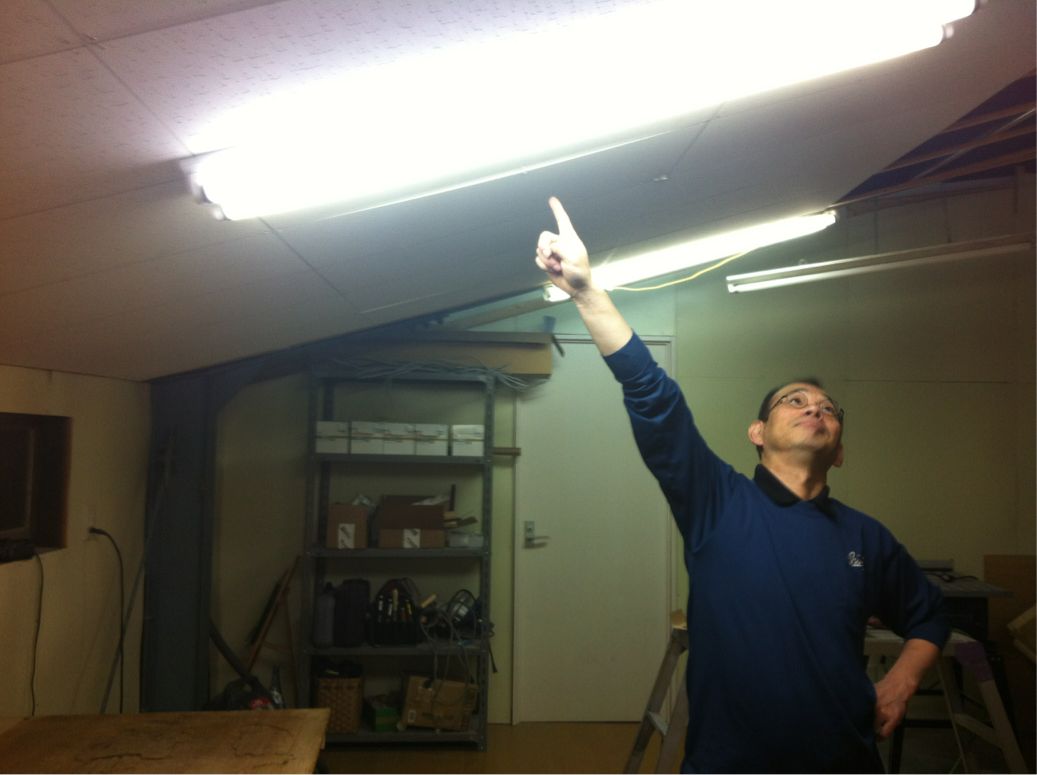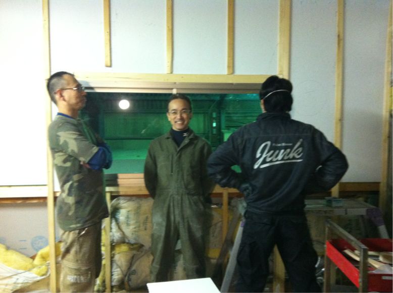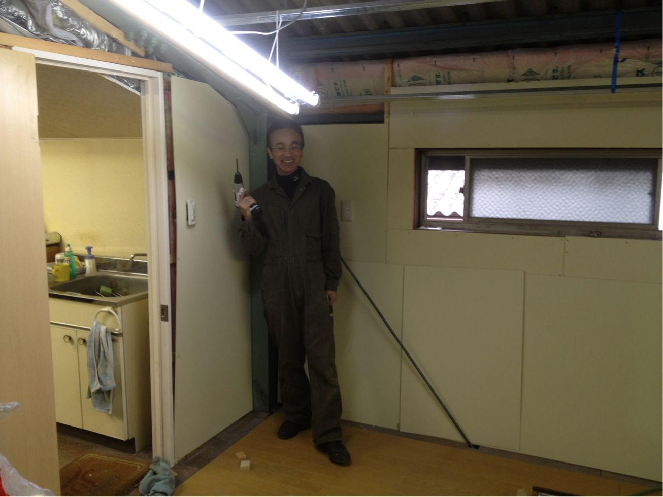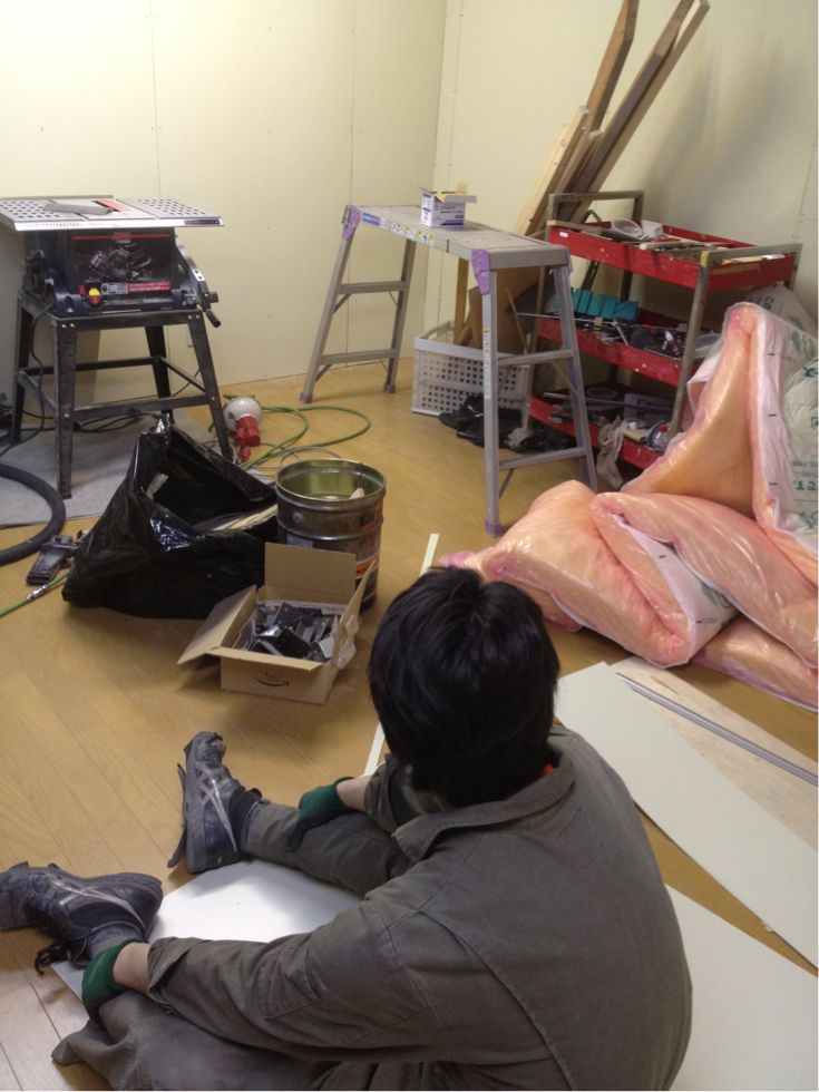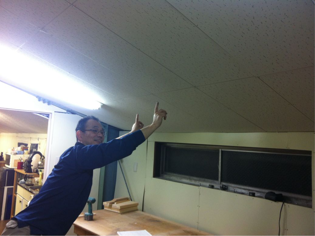工作室も周りの壁が概ね貼れて、今日は仮の電気がつきました、ぱちぱちぱち
