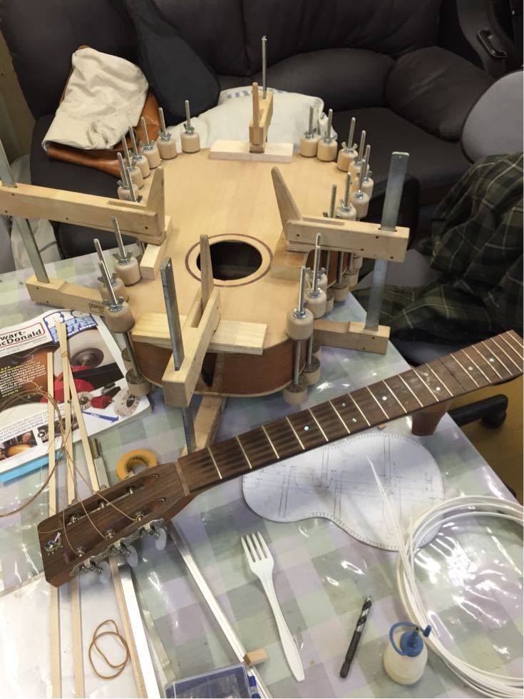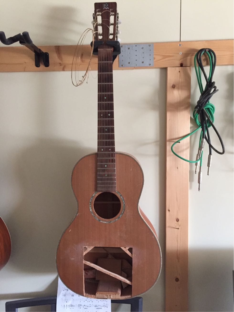 初めて一から作ったギター、とても気に入っていたのだが、トップを薄くしすぎていて、トップのふくらみが限界に来ていたのであれこれいじっていたら、破壊、、、